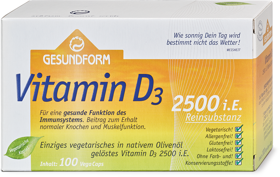 Wir empfehlen Vitamin D3 aus unserer GESUNDFORM Produktreihe, um Sie auch im Sommer bestens zu unterstützen.